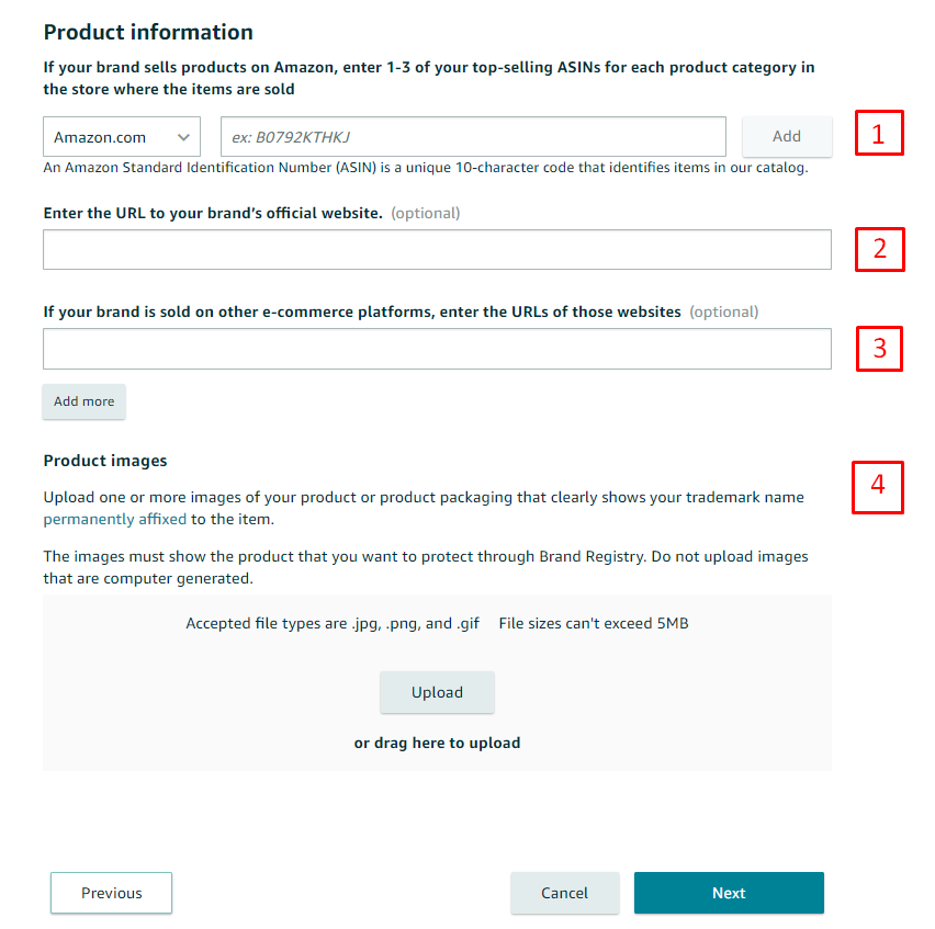 1. Optional – If you are already selling products on Amazon under the same brand name, add its ASIN if not leave it blank (a 10-character Amazon Standard Identification Number, for example, B07Z3173JP)